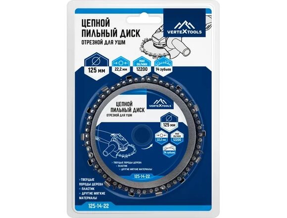 Цепной пильный диск отрезной для УШМ vertextools 125-14-22 предназначен для резки и обработки древесины и древесных материалов, фрезерования, моделирования. Подходит для резки твердых пород дерева, пластика и других мягких материалов.