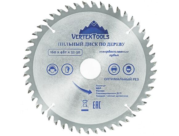 Пильный диск по дереву Vertextools 160-48-32 предназначен для выполнения точных продольных и поперечных чистовых пропилов в мягкой и твердой древесине, прессованной слоистой древесине, фанере, ламинате и ДСП. Напаянные индуктивным способом твердосплавные переменные зубья с агрессивным углом резания обеспечивают одновременно быстрое и точное пиление. Чистота распила зависит от количества зубьев и расстояния между ними. Чем больше зубья, тем чище распил. Основа выполнена из углеродистой стали, напайки на зубах из карбидно-вольфрамового сплава (победита).