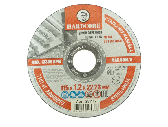 Круг отрезной по металлу и нержстали HARDCORE 115*1,2*22,2мм (10/50/600 )