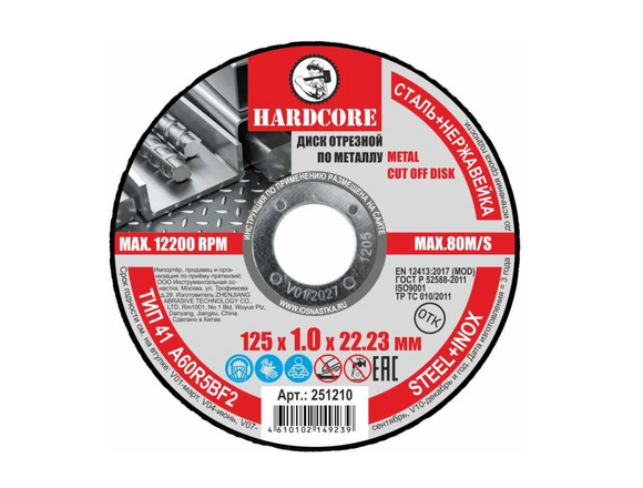 Круг отрезной по металлу и нержстали HARDCORE 125*1,0*22,2мм (10/50/600 )