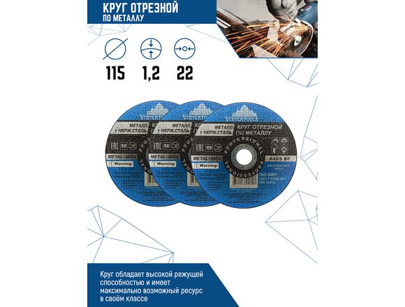 Круг отрезной по металлу 115x1х22.2 мм vertextools 115-1-22,2 позволяет эффективно пилить листы из черного и цветного металла, резать металлические профили и трубы.Режущая часть изготовлена из кристаллов оксида алюминия. Для повышенной прочности круг содержит стекловолоконные сетки с многослойным армированием. Выдерживает продолжительную эксплуатацию и соответствует требованиям техники безопасности.Режущая часть изготовлена из кристаллов оксида алюминия. Для повышенной прочности круг содержит стекловолоконные сетки с многослойным армированием.Круг отрезной обладает замечательным режущими свойствами, которые были выработаны благодаря абразивуКруги отрезные применяются на УШМ для резки металлических деталей и заготовок, строительной арматуры и других материалов.
