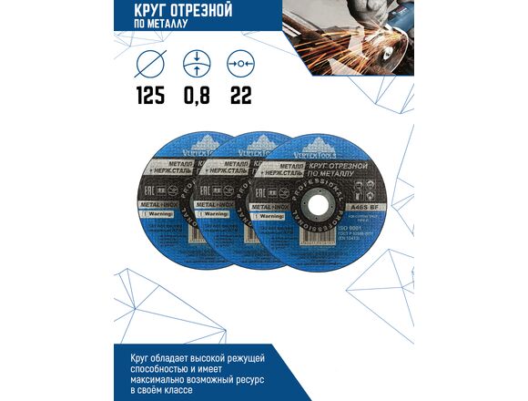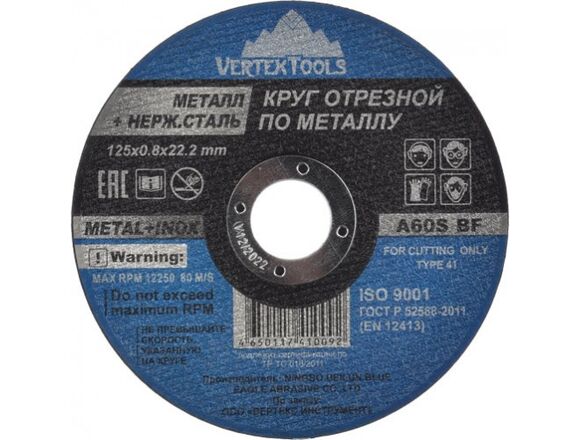 Круг отрезной по металлу 125x0.8x22 мм vertextools 125-0,8-22 позволяет эффективно пилить листы из черного и цветного металла, резать металлические профили и трубы.Режущая часть изготовлена из кристаллов оксида алюминия. Для повышенной прочности круг содержит стекловолоконные сетки с многослойным армированием. Выдерживает продолжительную эксплуатацию и соответствует требованиям техники безопасности.Режущая часть изготовлена из кристаллов оксида алюминия. Для повышенной прочности круг содержит стекловолоконные сетки с многослойным армированием.Круг отрезной обладает замечательным режущими свойствами, которые были выработаны благодаря абразивуКруги отрезные применяются на УШМ для резки металлических деталей и заготовок, строительной арматуры и других материалов.