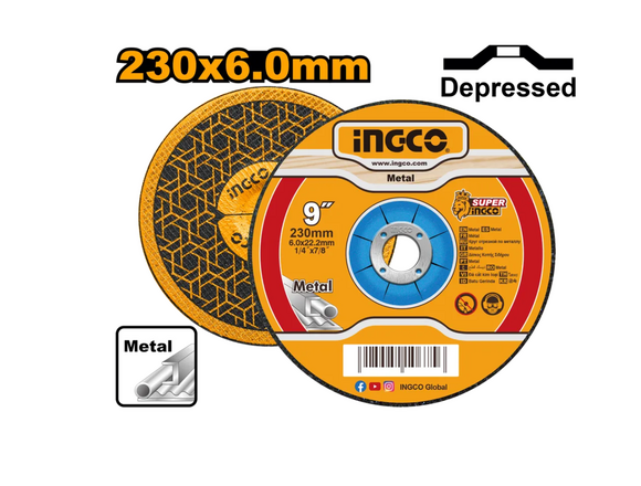 Круг зачистной по металлу (230x6х22 мм; A 24 RBF; тип 27) INGCO MGD602301 применяется совместно с угловыми шлифовальными машинами для обработки металлических изделий. Имеет высокую производительность.
