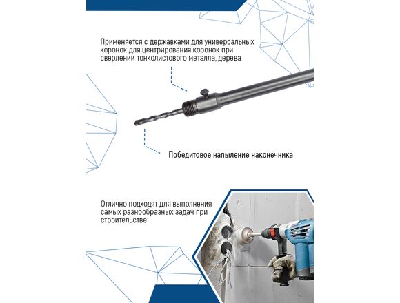 Хвостовик SDS-MAX 22x300 мм vertextools 212-300 изготовлен из легированной инструментальной стали и выдерживает нагрузки, возникающие при сверлении отверстий коронками в бетоне. Центрирующее сверло надёжно крепится в держателе. Резьбовое соединение М22 фиксируется по вращению.
