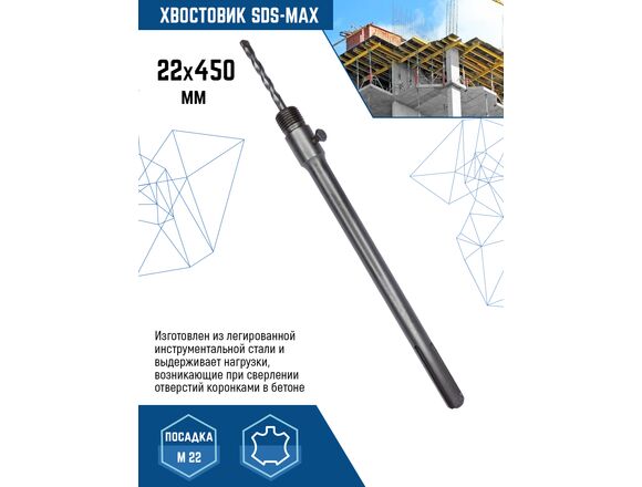 Хвостовик SDS-MAX 22x450 мм vertextools 212-450 изготовлен из легированной инструментальной стали и выдерживает нагрузки, возникающие при сверлении отверстий коронками в бетоне. Центрирующее сверло надёжно крепится в держателе. Резьбовое соединение М22 фиксируется по вращению.