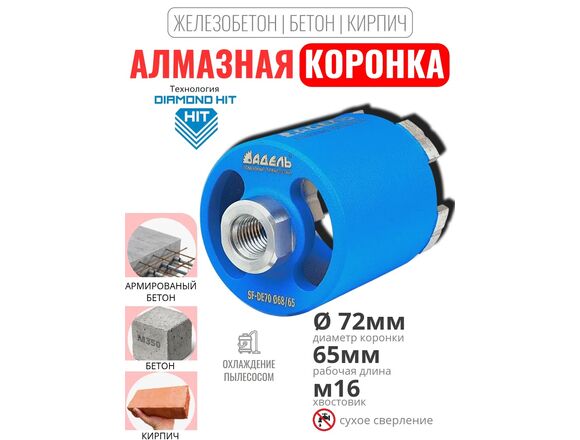 Алмазная коронкa для подрозетников Super Fast ∅72 мм с пылеудалением – инструмент для сверления отверстий в армированном бетоне, бетонных блоках, газобетоне или кирпиче для установки подрозетников. Оснастка используется для сверления сухим способом, имеет ресурс в 100 отверстий. Данная модель подходит для совместного использования с алмазным оборудованием мощностью от 1200 Вт. В производстве инструментов используются прочные, надежные материалы, что обеспечивает длительный эксплуатационный срок.