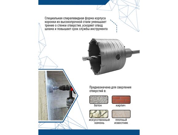 Коронка в сборе по бетону (40 мм; М22) Vertextools 222-0040 изготовлена из углеродистой стали. Для твёрдосплавных зубьев используется сплав марки ВК8. На внешней поверхности коронки имеется специальная спиральная канавка для вывода продуктов сверления, что позволяет снизить нагрузку на перфоратор.