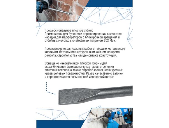 Предназначено для ударных работ с твердым материалом: кирпичом, бетоном или натуральным камнем, во время ремонта, строительства или демонтажа конструкций.