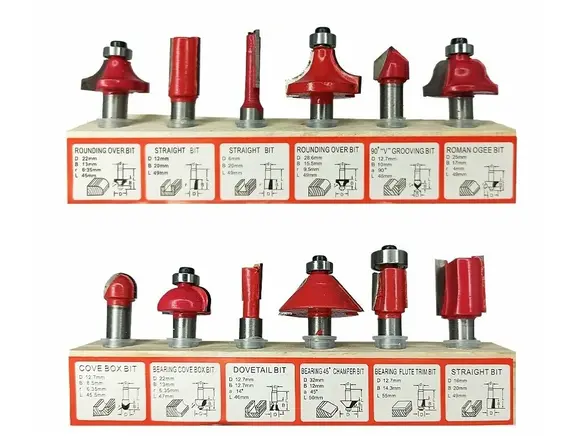Набор твердосплавных фрез по дереву 12 шт vertextools 05-05-0512 используется для фигурного фрезерования дерева. Подходит для ДСП, МДФ, лиственных и хвойных пород.