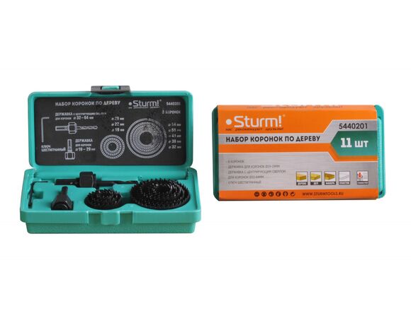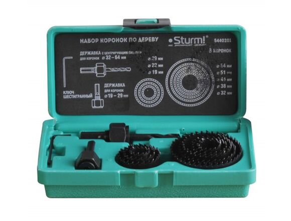 Набор коронок Sturm 5440201 предназначен для выполнения отверстий в древесине различных диаметров. В наборе коронки диаметром: 19 мм, 22 мм, 29 мм, 32 мм, 38 мм, 44 мм, 51 мм, 64 мм. Зубья пил закалены и усилены. Продукты пиления легко удаляются через боковую прорезь. В комплекте поставляются две державки с центрирующим сверлом и шестигранный ключ.