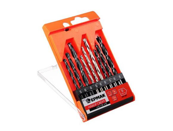 Набор сверл ЕРМАК 9 пр: по дереву (5-6-8 мм), по металлу (5-6-8 мм), по бетону (5-6-8 мм)