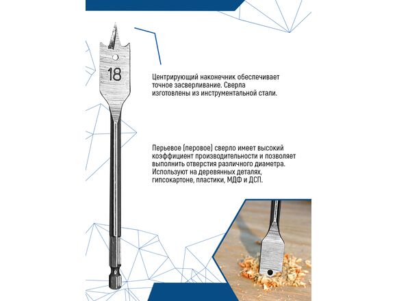 Сверло по дереву перовое Vertextools 1133-18 с шестигранным хвостовиком предназначено для дрелей, шуруповертов. Подходит для работы с древесиной, ДСП, МДФ, фанерой, гипсокартоном. Сверло изготовлено из инструментальной стали, закаленной в рабочей части. Оснащено очерчивающим остриём, что позволяет получить ровное, цельное отверстие. Шестигранный хвостовик обеспечивает надежное закрепление в патроне. Перовое сверло имеет высокий коэффициент производительности и позволяет выполнить отверстия различного диаметра. Для получения наилучшего результата и чтобы продлить период эксплуатации, соблюдайте правила: Начинайте сверлить на малых оборотах дрели постепенно добавляя, но не более 300-450 об/мин. Такой подход позволяет добиться более качественных результатов и сохраняет сверло от деформации. Устанавливайте сверло выдержав угол в 90.