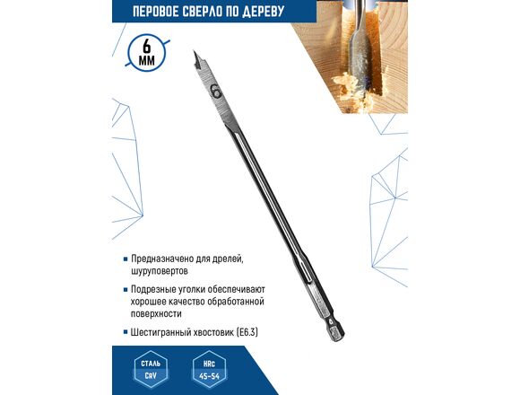 Сверло по дереву перовое vertextools 1133-6 с шестигранным хвостовиком предназначено для дрелей, шуруповертов. Подходит для работы с древесиной, ДСП, МДФ, фанерой, гипсокартоном. Сверло изготовлено из инструментальной стали, закаленной в рабочей части. Оснащено очерчивающим остриём, что позволяет получить ровное, цельное отверстие. Шестигранный хвостовик обеспечивает надежное закрепление в патроне. Перовое сверло имеет высокий коэффициент производительности и позволяет выполнить отверстия различного диаметра. Для получения наилучшего результата и чтобы продлить период эксплуатации, соблюдайте правила: Начинайте сверлить на малых оборотах дрели постепенно добавляя, но не более 300-450 об/мин. Такой подход позволяет добиться более качественных результатов и сохраняет сверло от деформации. Устанавливайте сверло выдержав угол в 90.