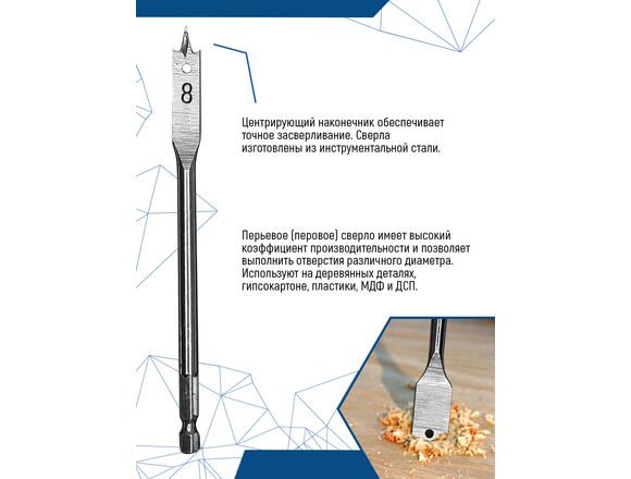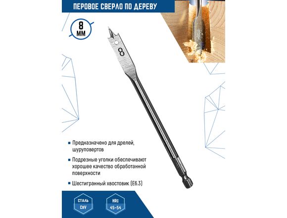 Сверло по дереву перовое vertextools 1133-8 с шестигранным хвостовиком предназначено для дрелей, шуруповертов. Подходит для работы с древесиной, ДСП, МДФ, фанерой, гипсокартоном. Сверло изготовлено из инструментальной стали, закаленной в рабочей части. Оснащено очерчивающим остриём, что позволяет получить ровное, цельное отверстие. Шестигранный хвостовик обеспечивает надежное закрепление в патроне. Перовое сверло имеет высокий коэффициент производительности и позволяет выполнить отверстия различного диаметра. Для получения наилучшего результата и чтобы продлить период эксплуатации, соблюдайте правила: Начинайте сверлить на малых оборотах дрели постепенно добавляя, но не более 300-450 об/мин. Такой подход позволяет добиться более качественных результатов и сохраняет сверло от деформации. Устанавливайте сверло выдержав угол в 90.