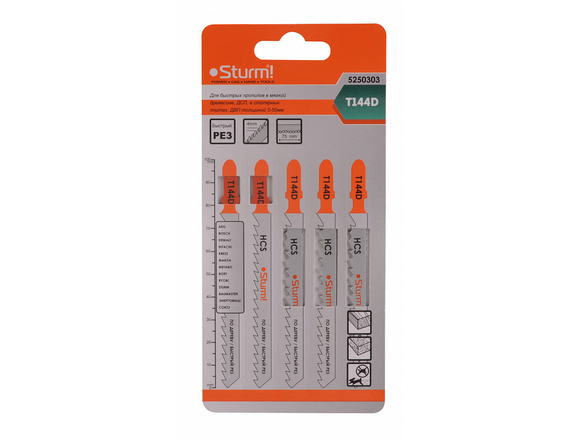 Пилки T144D Sturm 5250303 используются для быстрого пропила в древесине мягких сортов, ДСП, ДВП и столярных плитах толщиной 5-50 мм с помощью электролобзика. Выполнены из высокоуглеродистой стали, имеют длительный срок эксплуатации.
