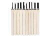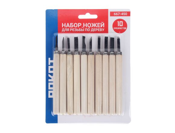 Набор ножей для резьбы по дереву РОКОТ 10 предметов 667-450 включает в себя инструмент с прочными деревянными рукоятками. Для резцов использована специальная сталь.