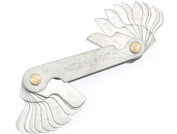 Резьбомер Дело Техники 239010 используется для определения шага метрической резьбы. Приспособление представляет собой набор шаблонов, в котором каждому значению резьбы соответствует свой шаблон. Совмещая шаблон с профилем резьбы определяется ее шаг. Каждый резьбомер имеет 24 щупа-эталона.