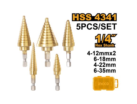 Набор ступенчатых сверл INGCO INDUSTRIAL 5шт 1/4" 4-12*2шт/4-22/6-18/6-35мм (1/30)