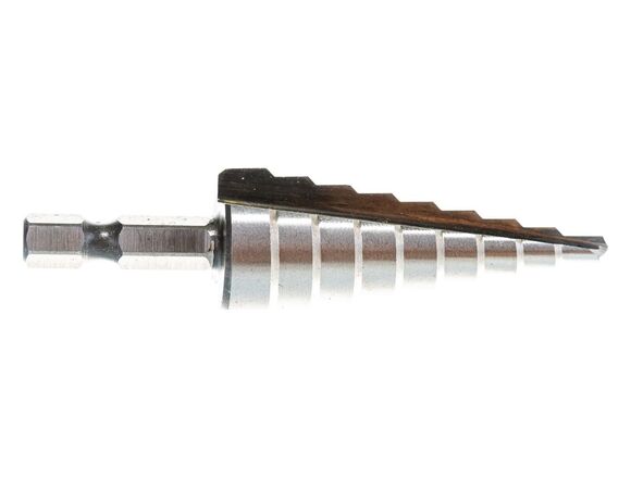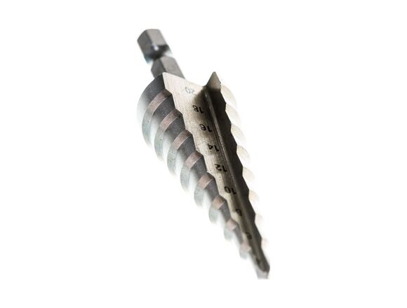 На каждой ступени есть маркировка фактического диаметра. Сверло изготовлено из быстрорежущей стали, имеют прямую спираль.
