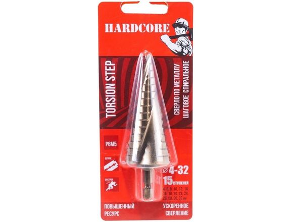 Сверло по металлу шаговое спиральное Hardcore 144432 предназначено для получения отверстий различного диаметра без перестановки режущего инструмента.