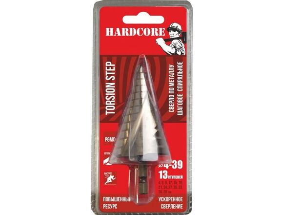 Сверло по металлу шаговое спиральное Hardcore 144439 предназначено для получения отверстий различного диаметра без перестановки режущего инструмента.