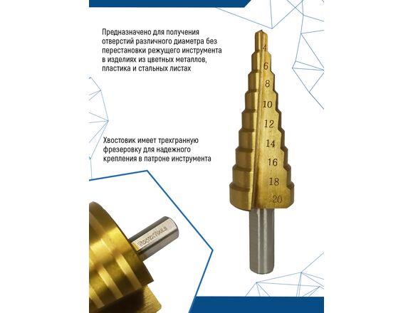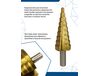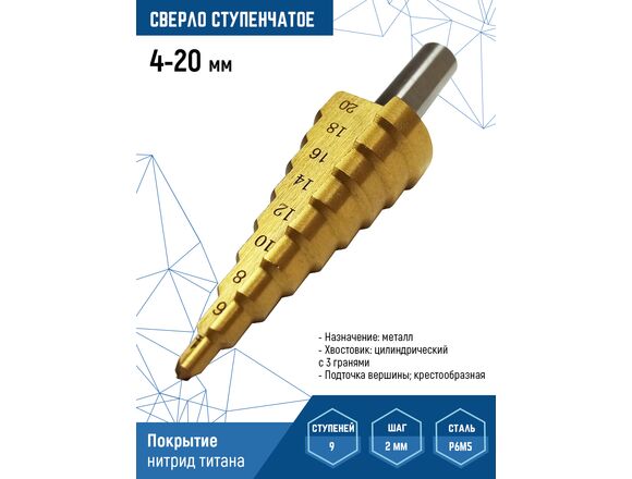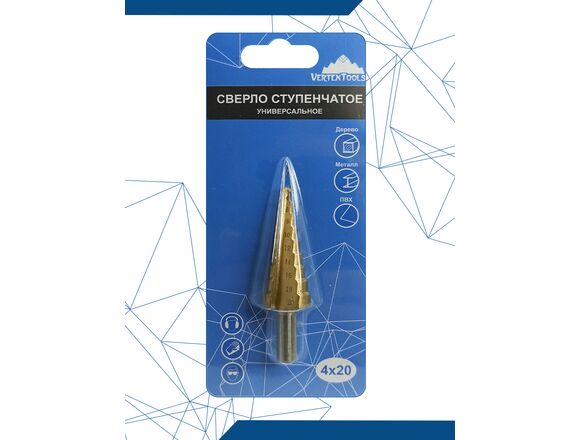 Сверло по металлу ступенчатое 4-20 мм vertextools 4-20 изготовлено из высококачественной быстрорежущей стали Р6М5 и предназначено для получения отверстий в листовых металлических и пластиковых материалах. Покрытие нитридом титана значительно увеличивает сопротивление перегреву во время сверления и срок службы сверла. Рекомендуется работать с использованием смазочно-охлаждающих жидкостей. Диаметр сверления 4-20 мм, шаг 2 мм.