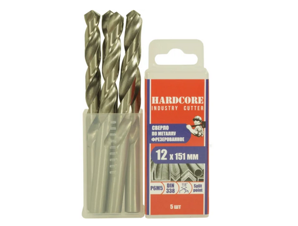 Сверло фрезерованное по металлу Industry cutter Р6М5, 12x151 мм, 5 шт Hardcore 146120 предназначено для дрелей. Используется для сверления отверстий в металле.