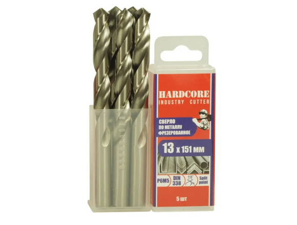 Сверло фрезерованное по металлу Industry cutter Р6М5, 13x151 мм, 5 шт Hardcore 146130 предназначено для дрелей. Используется для сверления отверстий в металле.