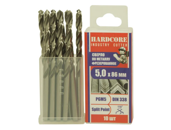 Сверло фрезерованное по металлу Industry cutter Р6М5, 5x86 мм, 10 шт Hardcore 146050 предназначено для дрелей. Используется для сверления отверстий в металле.