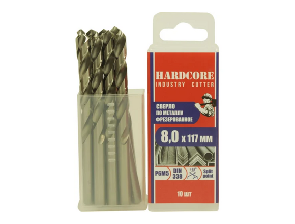 Сверло фрезерованное по металлу Industry cutter Р6М5, 8x117 мм, 10 шт Hardcore 146080 предназначено для дрелей. Используется для сверления отверстий в металле.