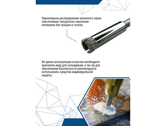 Рабочая кромка коронки имеет алмазное напыление, обеспечивающее высокую точность реза без трещин и сколов. Вертикальные пропилы в корпусе предотвращают деформацию коронки при нагреве во время работы.