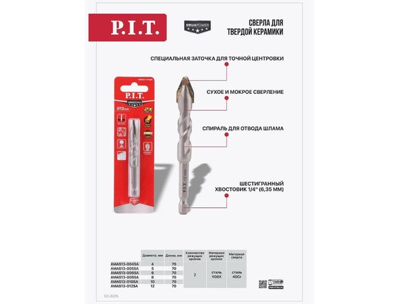 Сверло для твердой керамики P.I.T. DRUA Ø 8*70мм, 2 реж. кромки, спираль, хв. 1/4" (AM