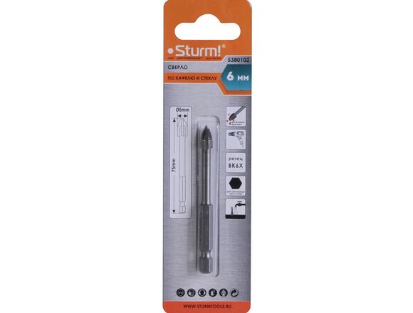 Сверло по стеклу и плитке STURM "крест" 6мм, шестинранный хвостовик (125/500)