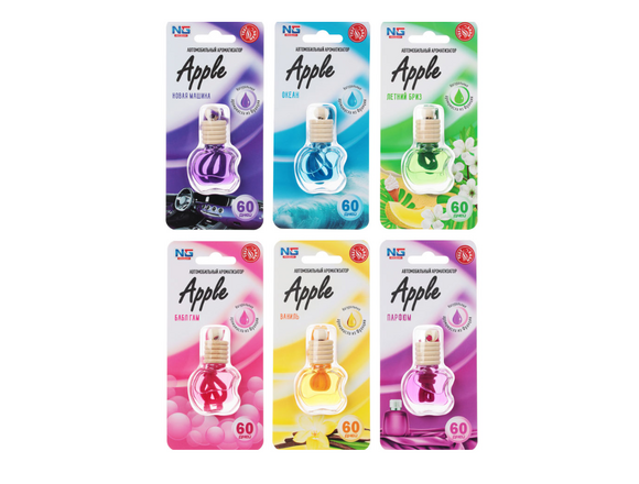 Подвесной ароматизатор NEW GALAXY Apple бабл гам, океан, новая машина, летний бриз, ваниль, парфюм 794-593 подвешивают на шнурок к зеркалу заднего вида. Бутылочка в форме логотипа Apple с деревянной крышкой: красиво выглядит, не мешает обзору.