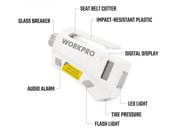 Многоцелевой аварийный инструмент WORKPRO (7 в 1) резак/сигнал/стеклобой/индик/кр свет/дав шин(1/12)