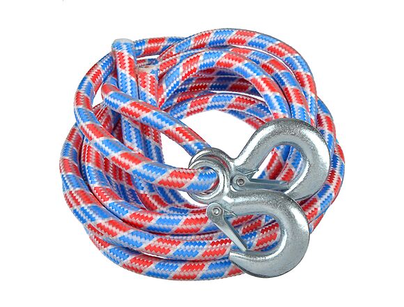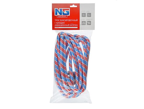Буксировочный трос NEW GALAXY авиационный капрон 5т, в пакете с 2 крюками, 5 м 773-023 – это предмет, который обязательно должен быть в багажнике любого автомобиля. Прочный и долговечный, поможет не только в случае поломки отбуксировать автомобиль, но и вытащить застрявшую машину из снега или грязи.