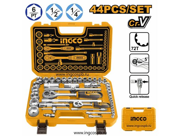 Набор головок и насадок INGCO INDUSTRIAL 44 предмета, 1/4"-1/2" (1/4)