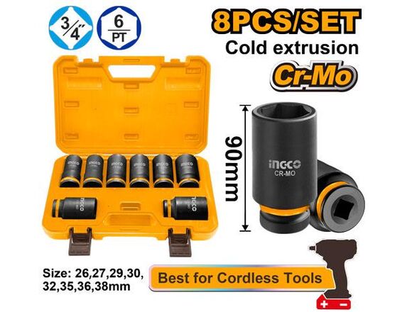 Набор головок ударных INGCO 3/4", 8шт, H=90мм, 26-38мм КЕЙС (1/2)