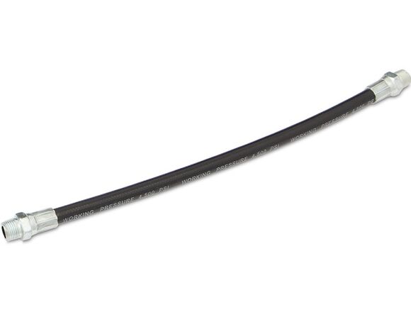 Шланг для шприца Дело Техники 250 мм 865931 изготовлен из вулканизированной резины, имеет дополнительное армирование и резьбовые фитинги по краям.