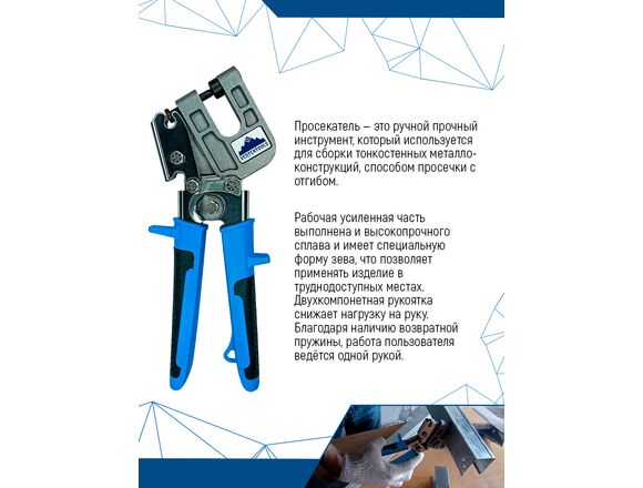 Просекатель для металлического профиля vertextools PROFI 0039-05 представляет собой прочный ручной инструмент, который используется для сборки тонкостенных металлоконструкций, способом просечки с отгибом. Рабочая усиленная часть выполнена из высокопрочного сплава и имеет специальную форму зева, что позволяет применять изделие в труднодоступных местах. Двухкомпонентная рукоятка снижает нагрузку на руку. Благодаря наличию возвратной пружины работа пользователя ведется одной рукой.