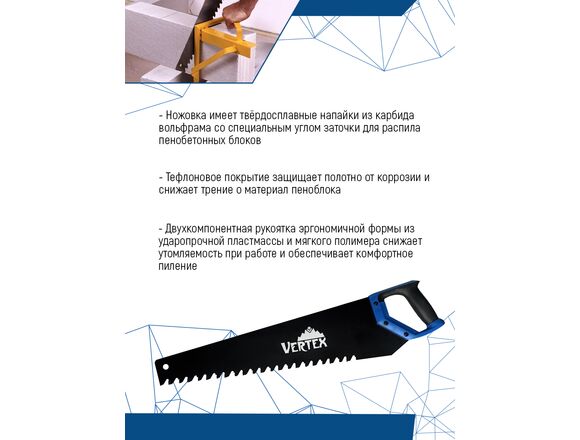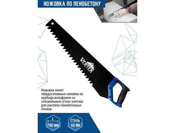 Ножовка по пенобетону vertextools 700 мм 0045-700 служит для распила заготовок, может применяться на строительных площадках или в ремонтных мастерских. Инструмент имеет твердосплавные напайки из карбида вольфрама, а также специальный угол заточки зубьев, что и позволяет совершать аккуратный чистый рез. Тефлоновое покрытие защищает от коррозии. Двухкомпонентная рукоять не скользит в руке.