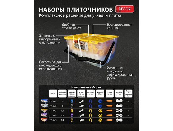 СВП набор плиточника №4 DECOR зажим "ФЛАЖОК" 1,4мм*500шт+клин PRO-160шт+крест/клин/подкова/планка