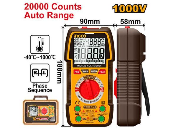 Мультиметр цифровой 1000В TRUR RMS 20000 counts INGCO INDUSTRIAL (6/24)