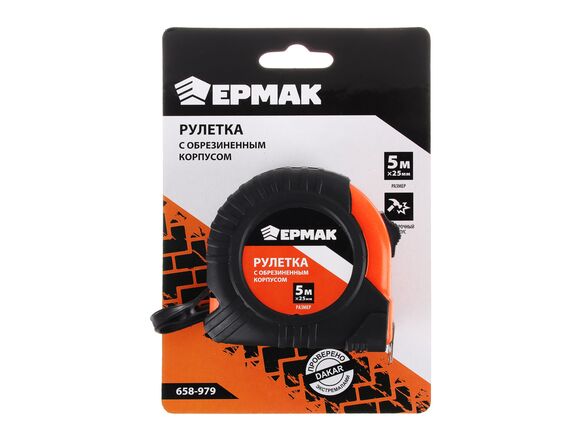 Рулетка ЕРМАК с обрезиненным корпусом, 5мх25мм 658-979 предназначается для проведения измерительных работ. Надежный сматывающий механизм и корпус из ударопрочного пластика обеспечивают долгий срок службы инструмента.