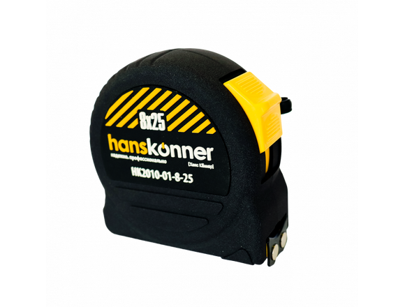 Рулетка Hanskonner 8x25 HK2010-01-8-25 оснащена полотном из хромванадиевой стали с увеличенной толщиной по сравнению с обычными рулетками. Это обеспечивает более дальний вылет без излома ленты. Предельная длина достигает 220 см.