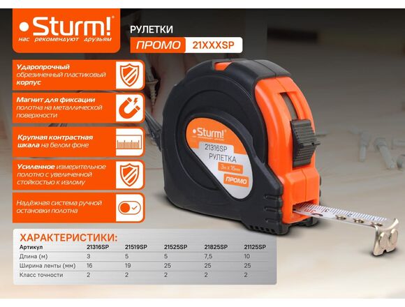 Рулетка STURM ПРОМО 5*25мм ОБРЕЗИНЕННЫЙ корпус КЛАСС ТОЧНОСТИ II, УСИЛЕН магнит (1/12/96)