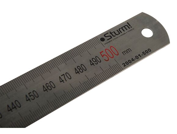 Отверстие на металлической линейке Sturm 2040-01-500 позволяет хранить ее в подвешенном состоянии.
