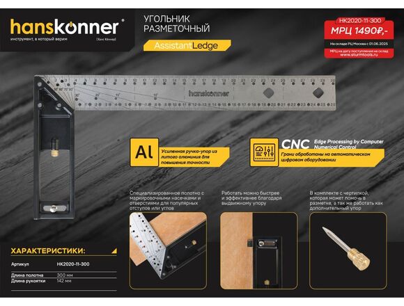 Угольник HANSKONNER 300мм, нерж + AL, выдвижной упор, встроенная ЧЕРТИЛКА (1/6)