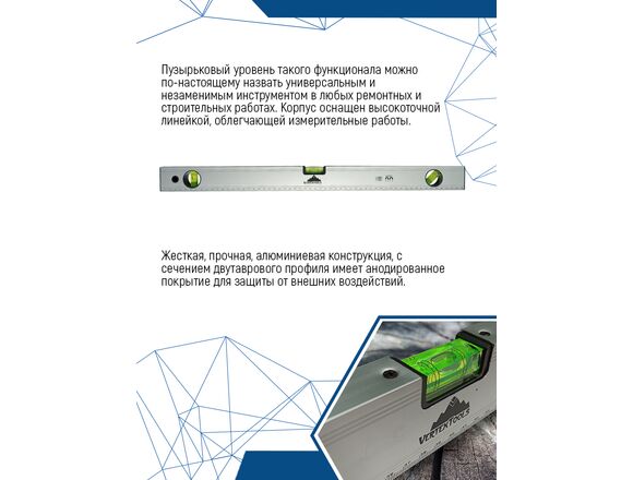 Алюминиевый уровень Vertextools 600мм 3033-600 применяется для оценки соответствия поверхностей вертикальной или горизонтальной плоскости, а также для измерения углового отклонения поверхности от горизонтали или вертикали.Данный инструмент оснащен тремя ампулами, что обеспечивает возможность проведения измерений в нескольких плоскостях.Уровень прост в использовании и неприхотлив в уходе. При правильном и аккуратном использовании долговечен.Незаменим при работе с металлическими поверхностями из-за встроенных в корпус магнитов.