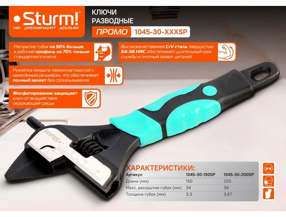 Ключ разводной STURM 200мм ПРОМО 39мм СУПЕРТОНКИЕ ГУБКИ, 2К ручка (6/48)